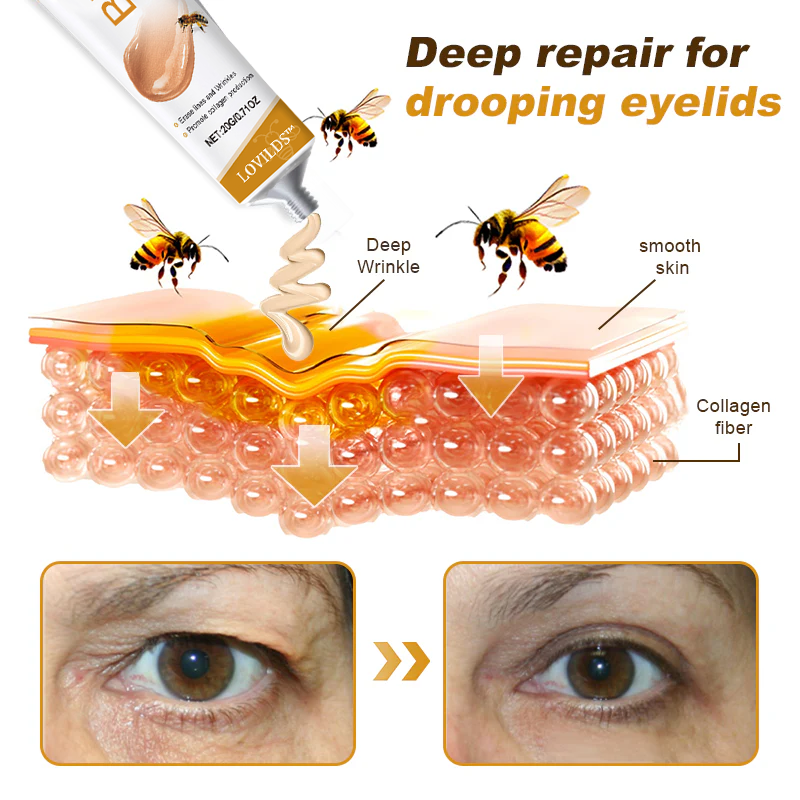 Bee Toxin Wrinkle Removal Cream combines cutting-edge technology with unique ingredients to specifically target and deeply repair drooping eyelids. Unlike typical products on the market, Bee Toxin Wrinkle Removal Cream not only stimulates collagen production to enhance the elasticity of the delicate skin around the eyes but also utilizes bee toxin peptides to accurately mimic the effects of. This relaxes the muscles around the eyes and lifts sagging eyelids. The unique formula penetrates deep into the skin, promotes blood circulation, and, together with hyaluronic acid's deep moisturizing effects, makes the skin around your eyes plump and full. This effectively reduces drooping eyelids, giving your eyes a youthful, firm appearance. Choose LOVILDS™ to experience true skincare innovation and completely say goodbye to drooping eyelids.