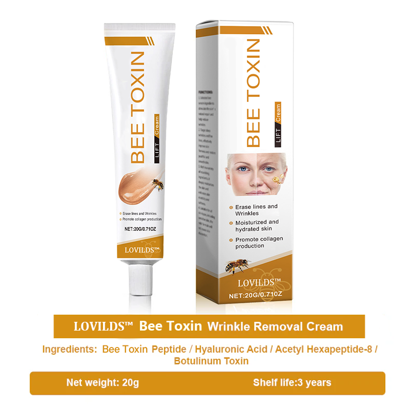 Bee Toxin Wrinkle Removal Cream stimulates collagen production, deeply firms the skin, and helps restore facial elasticity and contours. Bee toxin peptides mimic the effects of , relaxing facial muscles and lifting sagging areas to reshape well-defined, youthful facial lines. Powerful hydrating ingredients lock in moisture, keeping the skin plump and full, making your facial contours appear tighter and more youthful, with a natural glow.