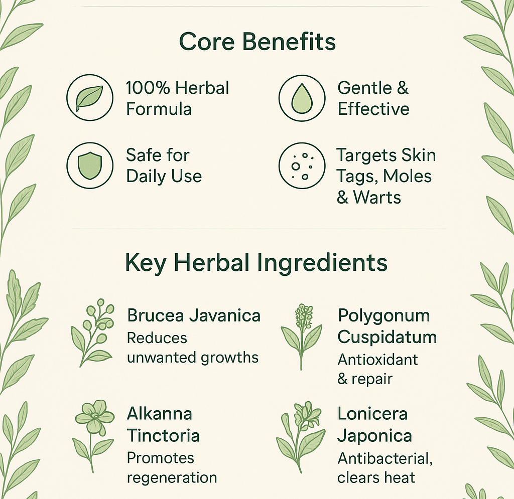 Unlike acid-based removers that burn tissue or surgical methods that cut growths away, our herbal formula works with your skin’s biology to encourage gentle, scar-free removal.