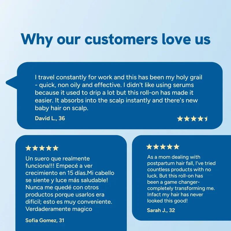 “I’ve tried shampoos and pills. This is the first thing that actually targets my hairline.” Daniel K. ⭐⭐⭐⭐⭐
